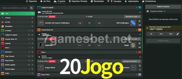 O 20Jogo oferece uma grande seleção de opções de apostas em e-sports com probabilidades competitivas